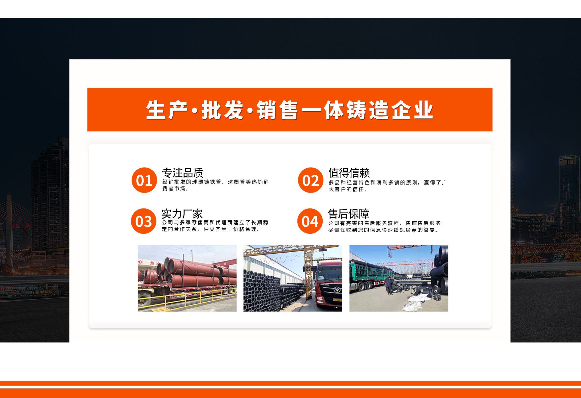 青島金源達(dá)管業(yè)有限公司主要經(jīng)營(yíng)各種規(guī)格球墨鑄鐵管,球墨管,球墨鑄鐵管廠家等產(chǎn)品,質(zhì)量可靠,誠(chéng)信經(jīng)營(yíng),值得信賴(lài)! 青島金源達(dá)管業(yè)有限公司始終堅(jiān)持“誠(chéng)信立業(yè),追求卓越,合作共贏,共同發(fā)展”,竭誠(chéng)歡迎各界朋友來(lái)廠參觀指導(dǎo),洽談業(yè)務(wù)。我們?cè)概c您攜手共進(jìn),互惠雙贏,共創(chuàng)未來(lái)! 公司堅(jiān)持“以?shī)^斗者為本”的理念,關(guān)心關(guān)愛(ài)職工,職工的獲得感、幸福感更加充實(shí)、更有保障、更可持續(xù);秉承“忠誠(chéng)企業(yè)、勇于擔(dān)當(dāng)、開(kāi)拓創(chuàng)新、主動(dòng)作為”,堅(jiān)持黨建領(lǐng)航、創(chuàng)新驅(qū)動(dòng)、文化塑魂、奉獻(xiàn)社會(huì),全面致力于綠色、低碳、高效、高質(zhì)量發(fā)展?! ≡概c各界朋友攜手并進(jìn),共創(chuàng)未來(lái)!...